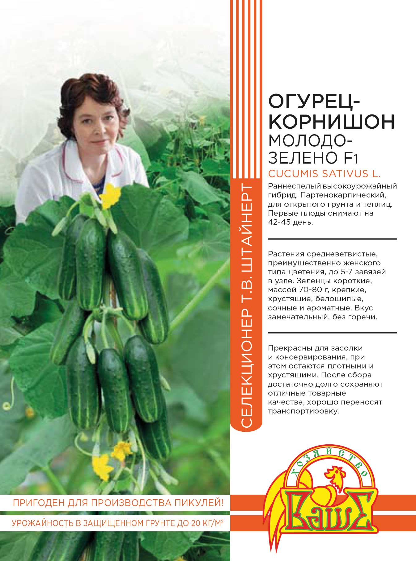 Среднеранний (50–52 дня) пчелоопыляемый сорт универсального использования для выращивания под пленочными укрытиями.