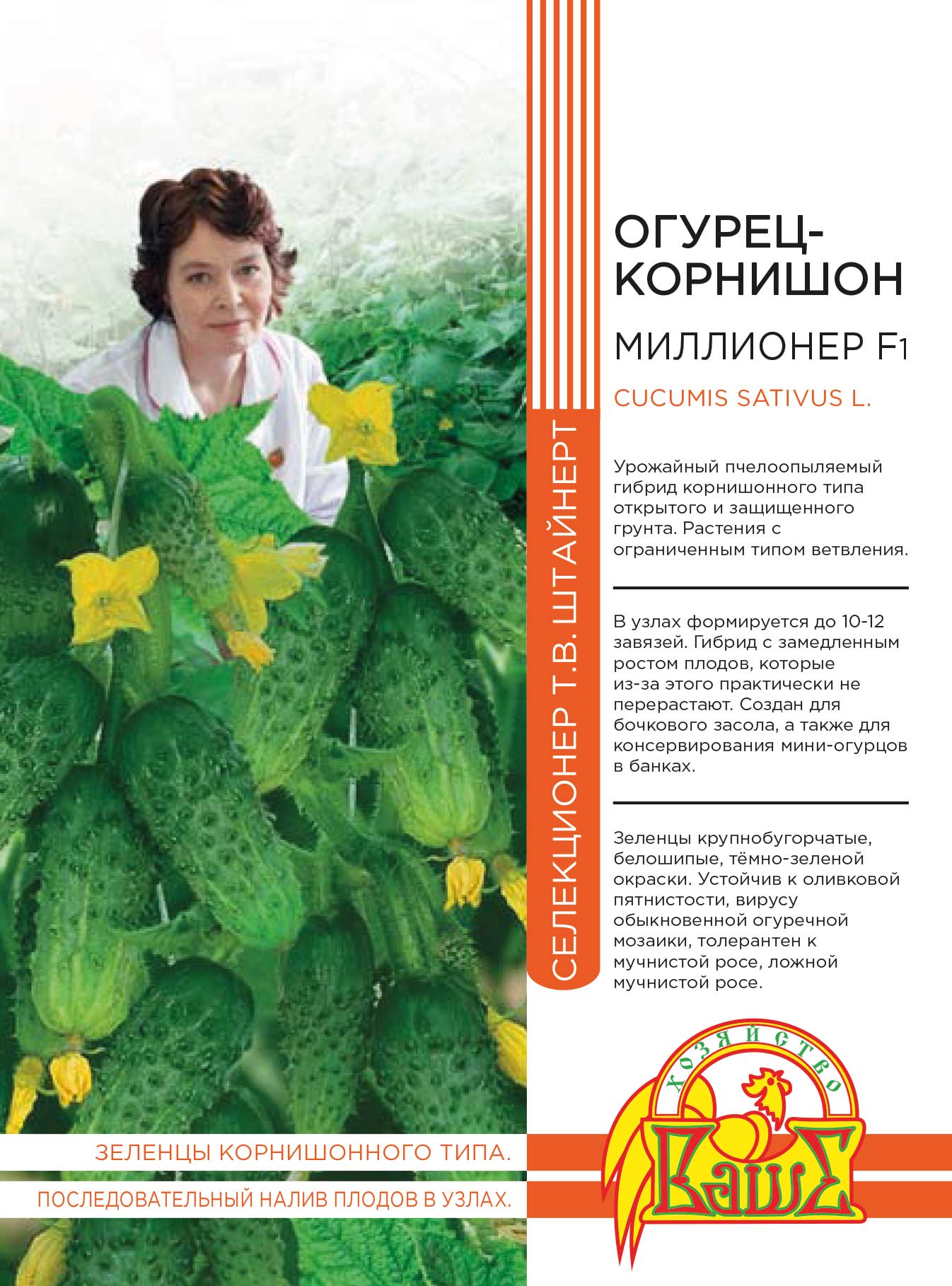 Ультраскороспелый партенокарпический гибрид.Гибрид — в рекордсменах по критерию «дружная отдача урожая», а чудо-букеты и урожайность восхитят даже бывалого садовода: по 5-7 завязей в каждом узле, результат — с одного растения — до 400 корнишонов. Огурчики — до 10 см в длину, плотные, без пустот и горечи, очень вкусные и ароматные.Длительный период плодоношения и универсальное использование плодов.