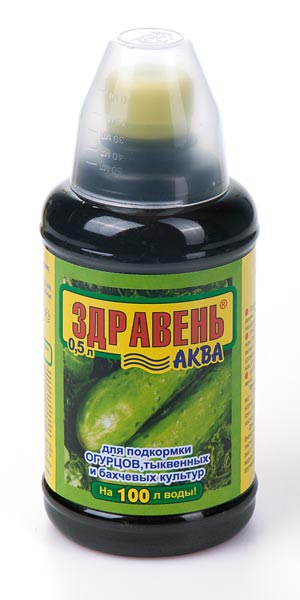 «ЗДРАВЕНЬ-АКВА ОГУРЦЫ» — жидкое комплексное органоминеральное удобрение для корневых и внекорневых подкормок огурцов, тыквенных и бахчевых культур в личных подсобных хозяйствах.